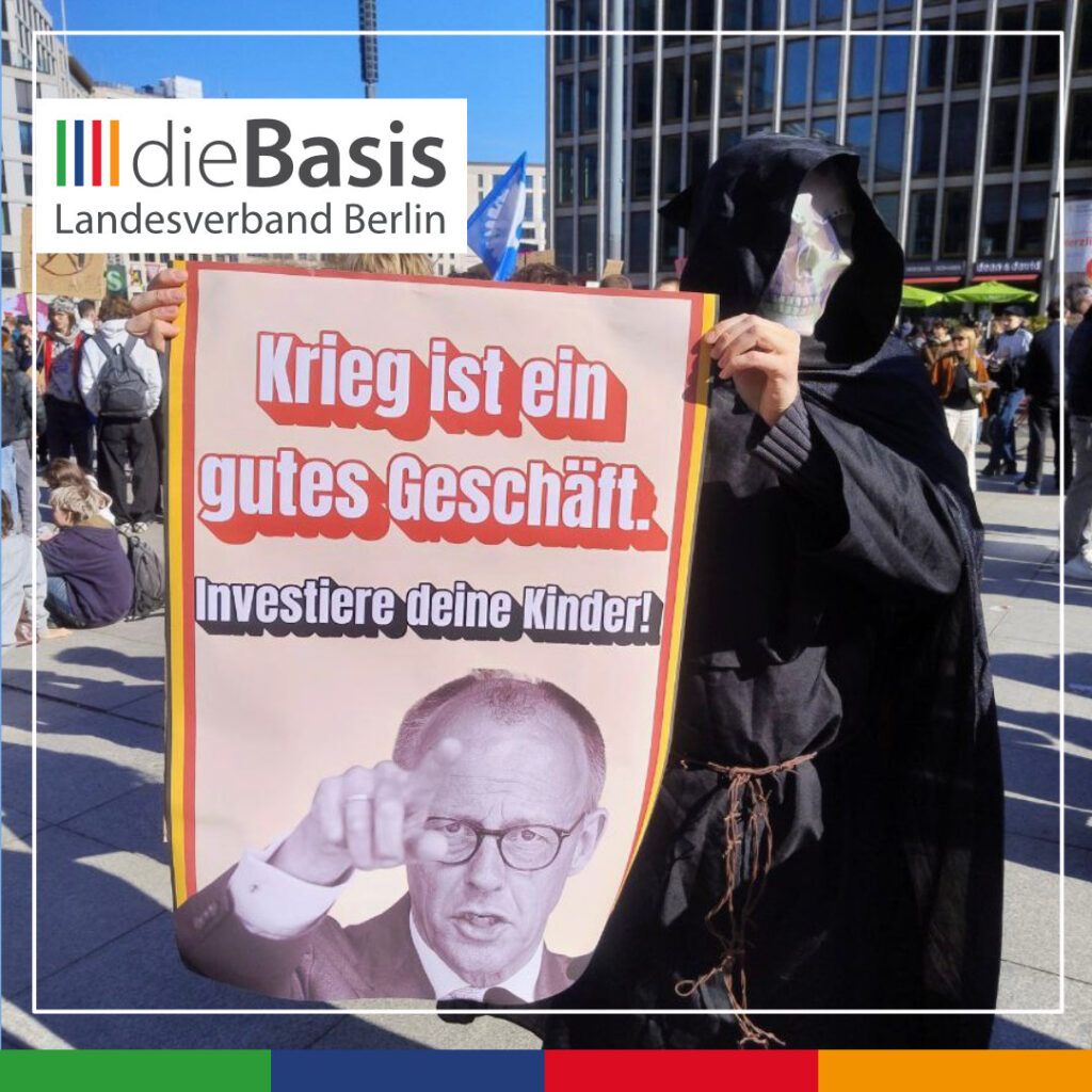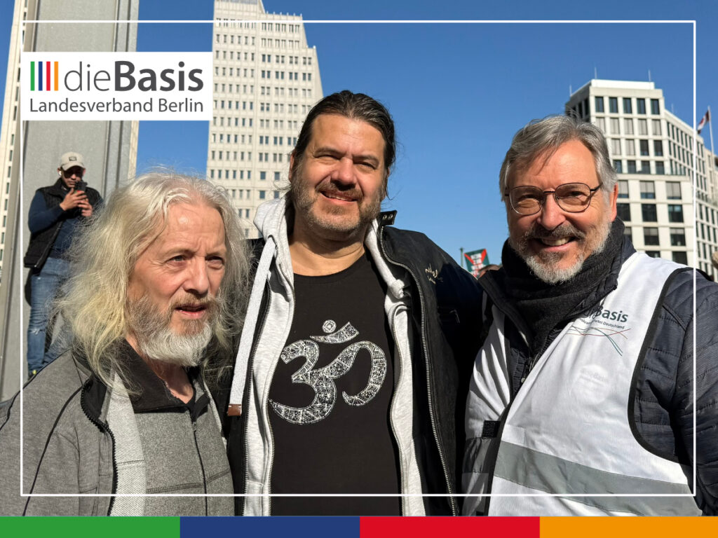 Auf dem Potsdamer Platz sah man aber nicht nur viele junge Leute, die wir in der Friedensbewegung und im Widerstand gegen die Corona-Maßnahmen des Staates lange vermisst hatten, sondern auch einige Senioren, die sich mit den Schülern solidarisierten. Die Basisdemokratische Partei Deutschland (dieBasis) war mit zwei Vertretern des Landesvorstands vor Ort: Dieter Bonitz und Dietmar Schmidt. Die Partei dieBasis hatte bei der Wiederholungswahl zum Abgeordnetenhaus 2023 mit einem achtseitigen Flugblatt geworben, das auf dem Titel die Losung „Worte statt Waffen“ trug. Damit wurde zum Ausdruck gebracht, dass wir Waffenproduktion und Waffenlieferungen ablehnen und diplomatische Lösungen anstreben. Das Flugblatt war überarbeitet und zur Mitgliederwerbung umformuliert worden. Dieses achtseitige Faltblatt, das auch andere Themen behandelte, haben wir verteilt.