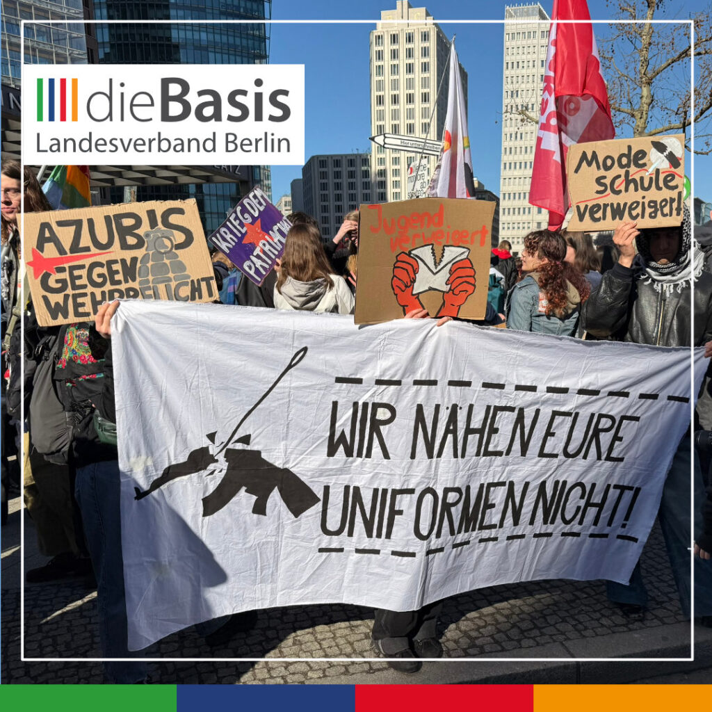 Auf dem Potsdamer Platz versammelten sich Donnerstagmorgen, den 5. März 2026, zahlreiche Schülerinnen und Schüler, um gegen die Reaktivierung der Wehrpflicht zu demonstrieren. Sie verbanden das mit einem Schulstreik, weil sie zu dieser Zeit dem Unterricht schwänzten. Die Aktion war ein Protest im Rahmen der Friedensbewegung. So wurde die Aktion auch logistisch von der bundesweit agierenden Friedenskoordination unterstützt.